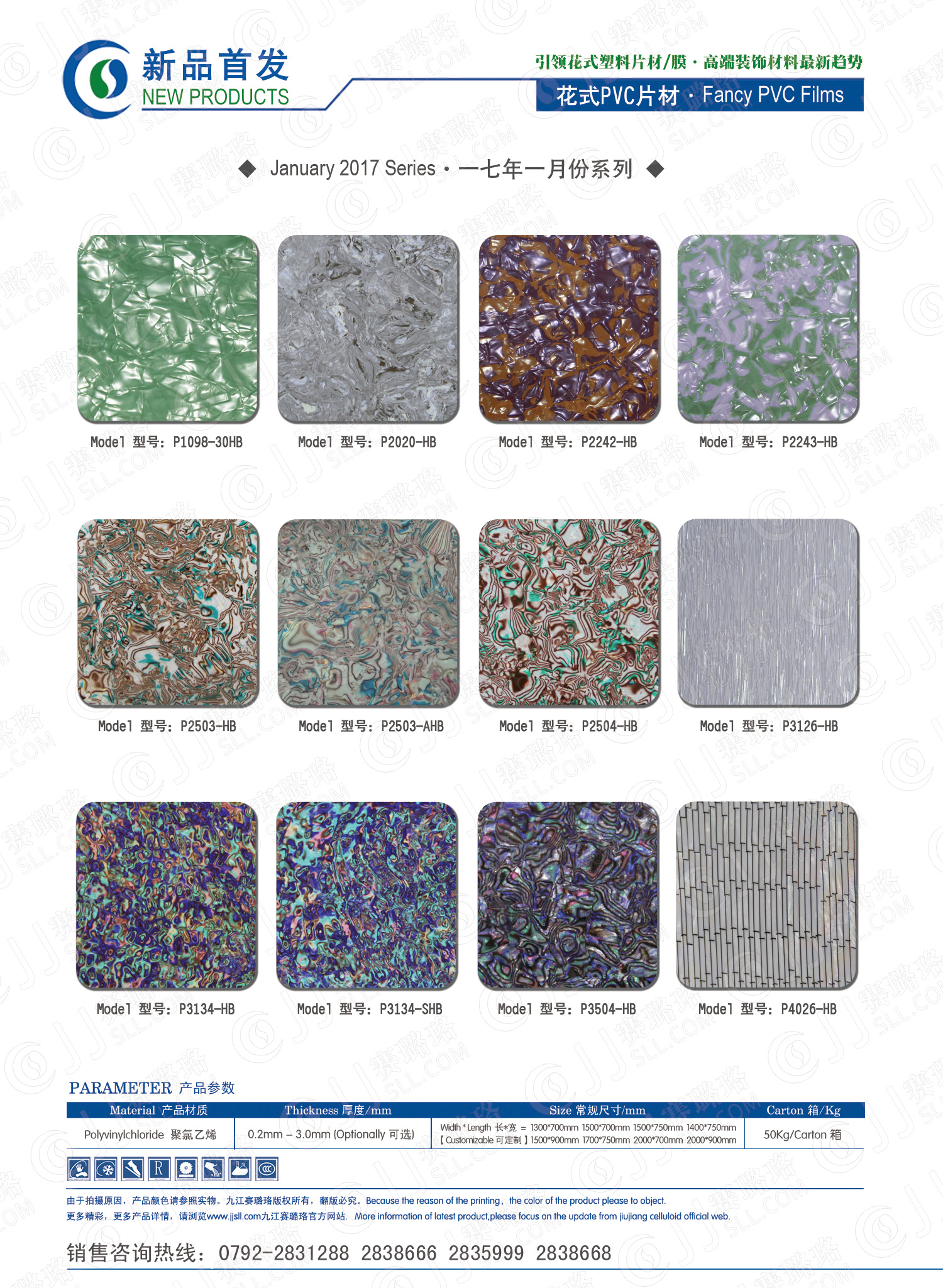 九江賽璐珞實業(yè)有限公司2017年一月份賽璐珞板材、瑪瑙膜、理石膜、樂器裝飾材料、花式PVC片材新品發(fā)布,花式塑料片材/膜·多彩裝飾材料先驅(qū)者。咨詢熱線:0792-2838668 / 2838666 / 2835999。點擊圖片查看詳細(xì)產(chǎn)品