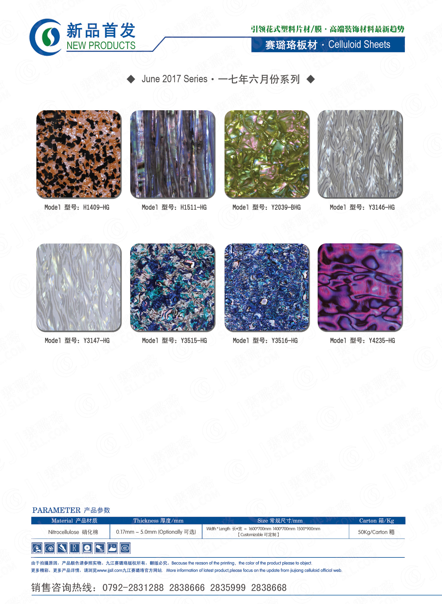 九江賽璐珞實業(yè)有限公司2017年五月及六月份賽璐珞板材、瑪瑙膜、理石膜、樂器裝飾材料、花式PVC片材新品發(fā)布,花式塑料片材/膜·多彩裝飾材料先驅(qū)者。咨詢熱線:0792-2838668 / 2831288 / 2838666 / 2835999。點擊圖片查看詳細(xì)產(chǎn)品