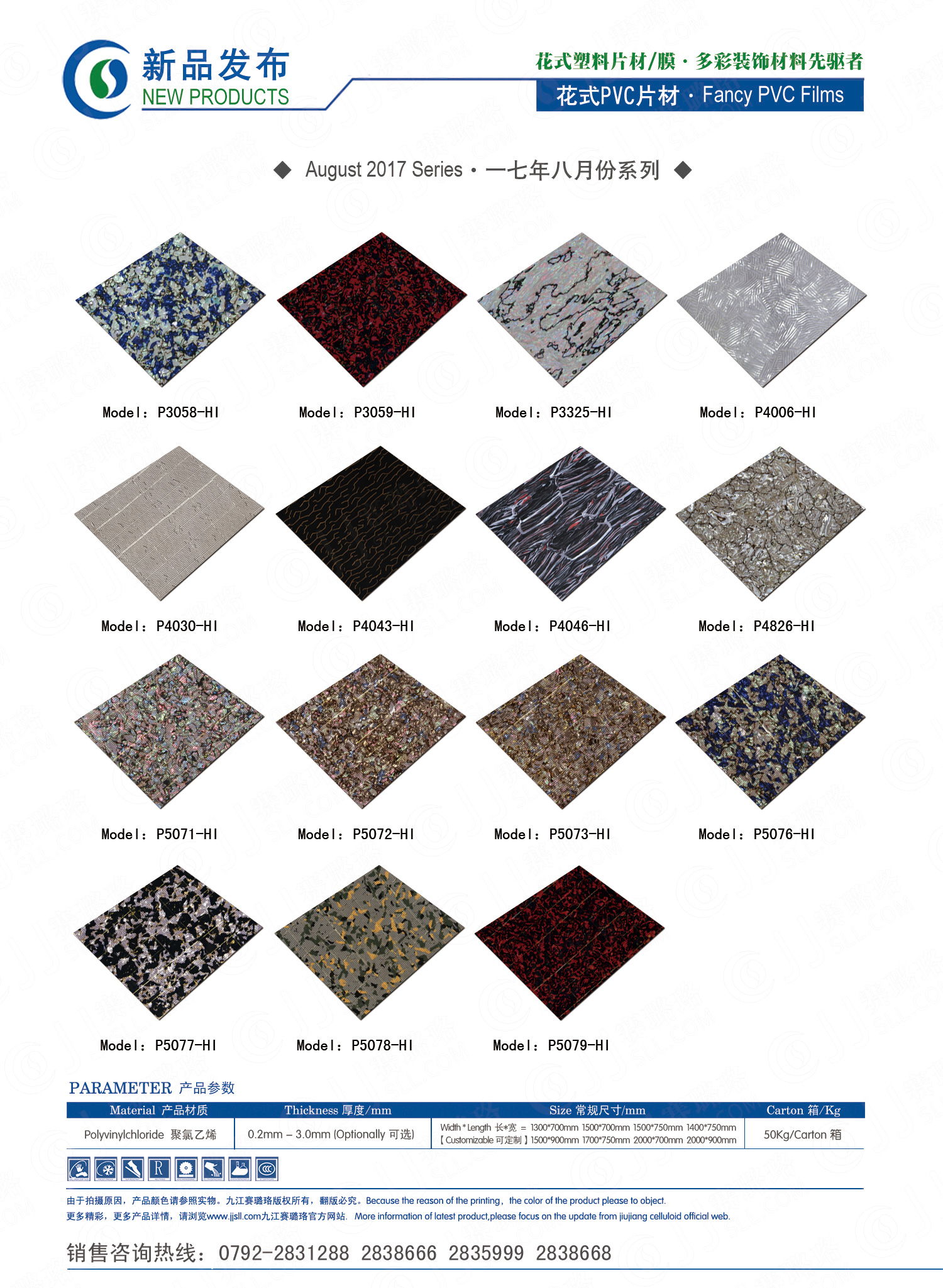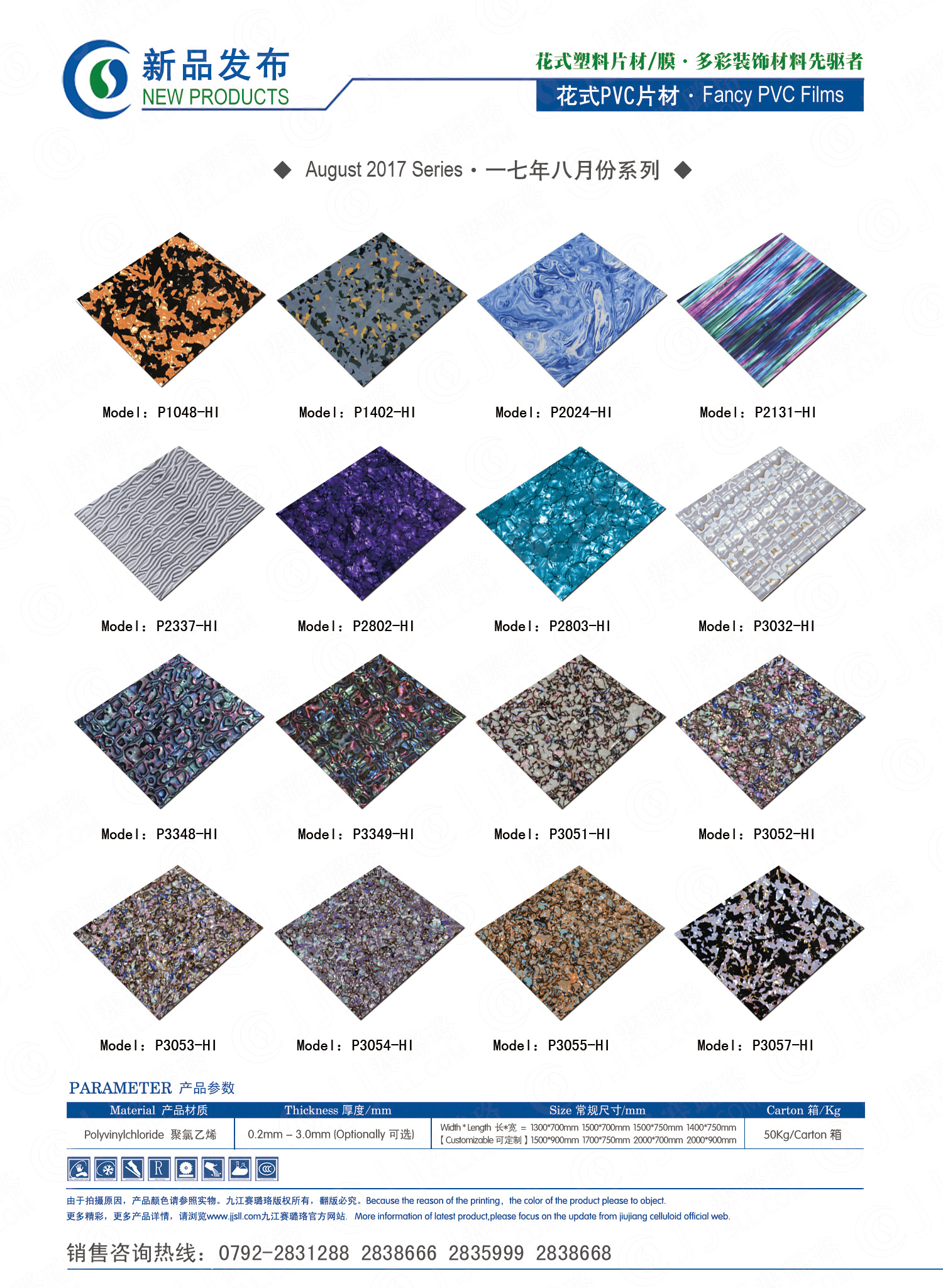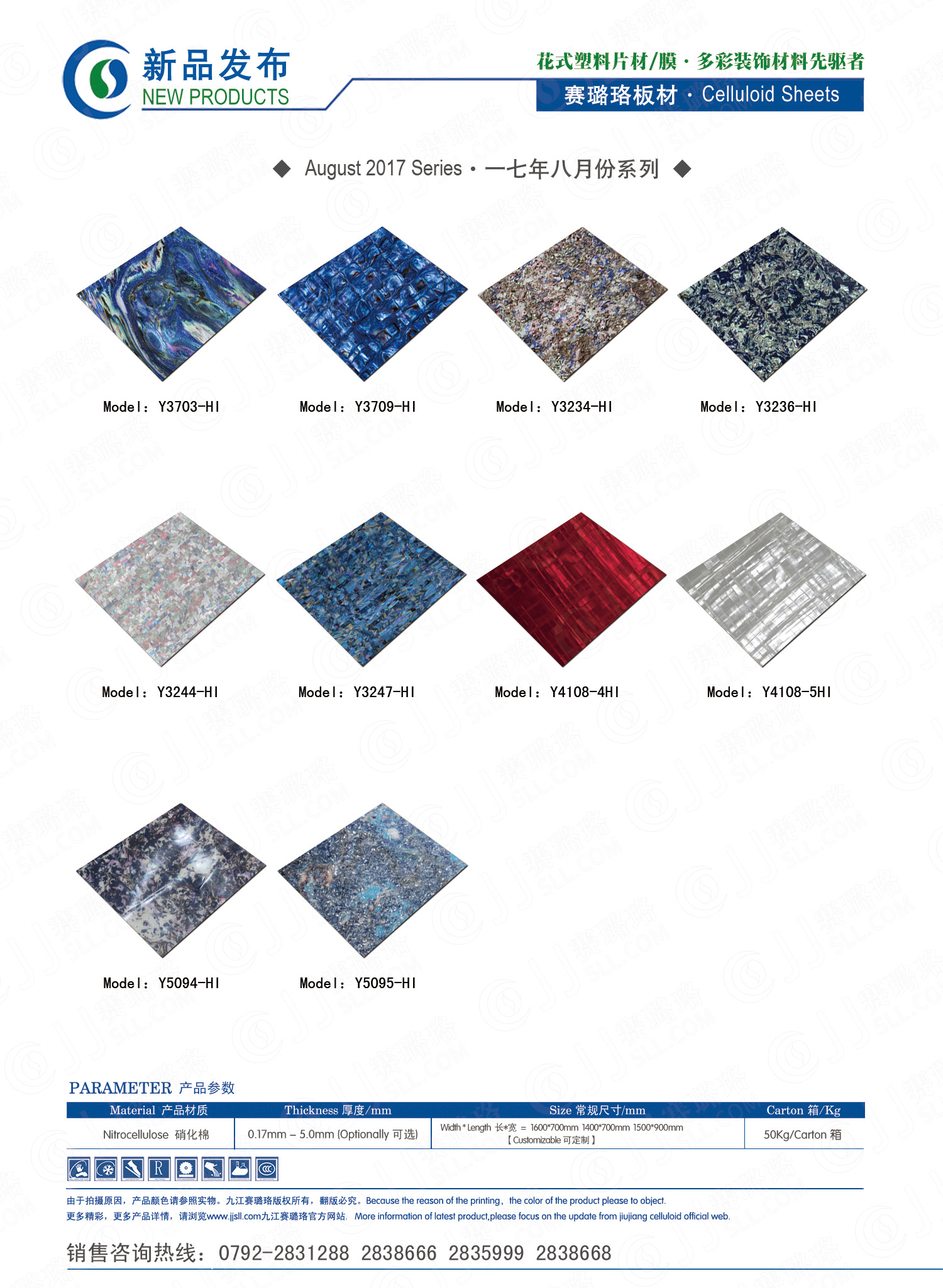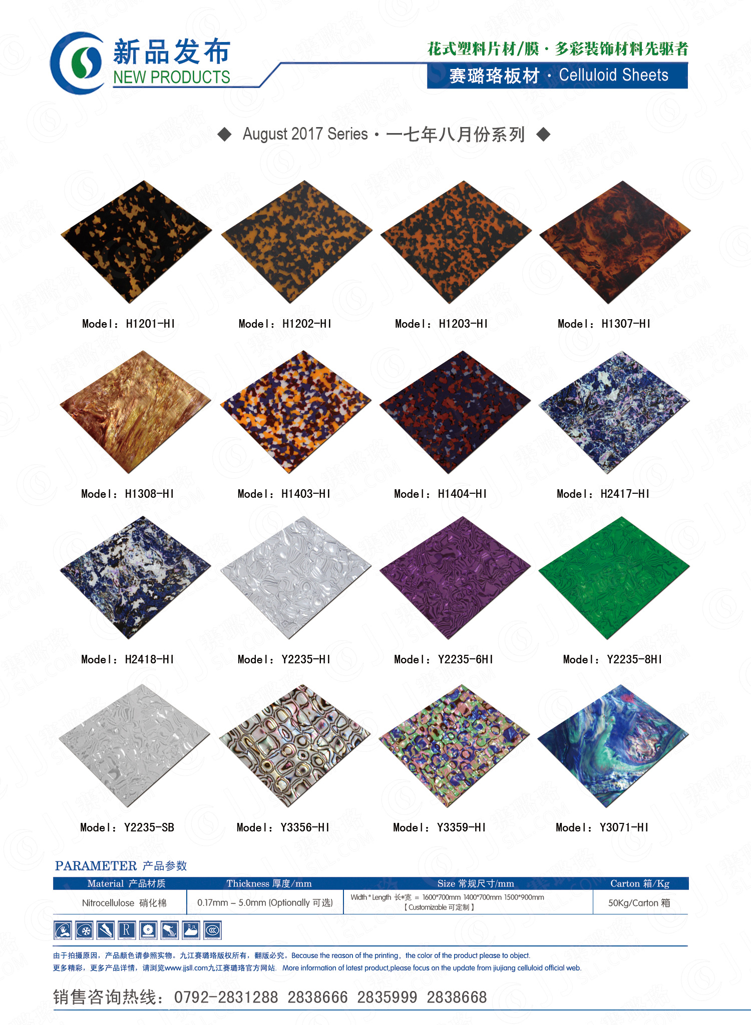 九江賽璐珞實業(yè)有限公司2017年八月份賽璐珞板材、瑪瑙膜、理石膜、樂器裝飾材料、花式PVC片材新品發(fā)布,花式塑料片材/膜·多彩裝飾材料先驅(qū)者。咨詢熱線:0792-2838668 / 2831288 / 2838666 / 2835999。點擊圖片查看詳細(xì)產(chǎn)品